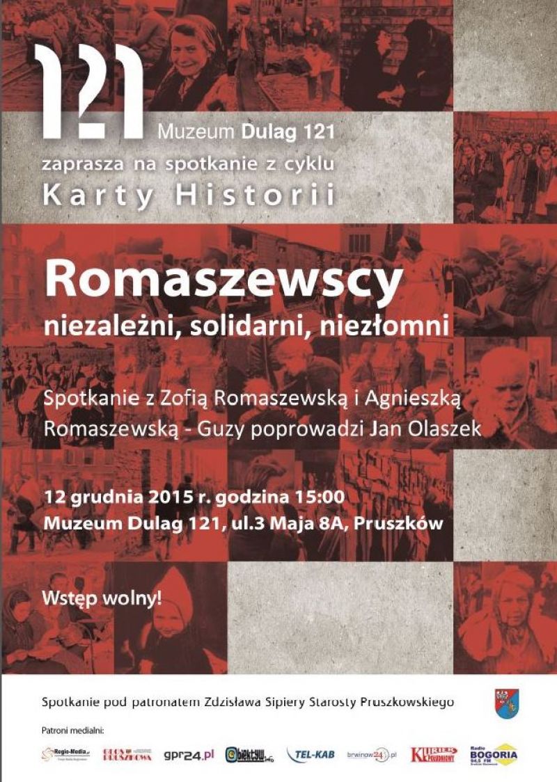 Spotkanie z Zofią Romaszewską i Agnieszką Romaszewską - Guzy odbędzie się w siedzibie Muzeum przy ul. 3 Maja 8A, 12 grudnia o godz. 15. Historia rodziny Romaszewskich to wspaniała karta w dziejach opozycji antykomunistycznej w Polsce. Od połowy lat 60 aż do końca istnienia PRL-u aktywnie działali na rzecz opozycji, m.in. w KOR i ,,Radiu Solidarność'', zaś w latach 1979-80 za za sprawą Zbigniewa Romaszewskiego został powołany Komitet Helsiński.